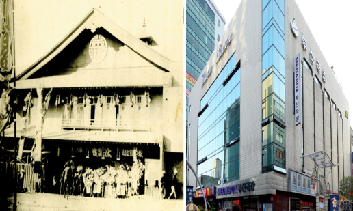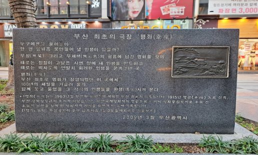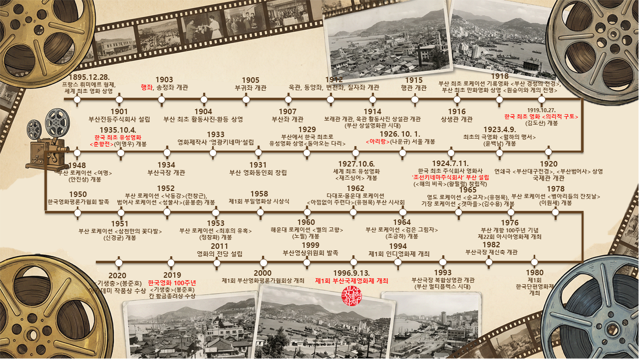 최초의 한국 영화는 1919년 김도산 감독·주연의 <의리적 구토>입니다.* 한국 영화계는 이 영화가 개봉한 10월 27일을 ‘영화의 날’로 기념하고 있으며, 한국 영화 100주년이던 2019년 봉준호 감독이 <기생충>으로 칸 영화제 황금종려상을, 2020년에는 아카데미 사상 최초로 외국어영화상 수상작이 최우수 작품상을 수상하면서 정점을 찍었습니다.(대한민국 정책브리핑. (2019.6.25). 영화 ‘기생충’으로 돌아본 한국 영화 100주년.) 한국 최초의 극장은 1895년 설립된 인천의 ‘협률사(協律社)’(現 애관극장)로 알려졌지만, 한국 최초의 활동사진 상영은 1904년 부산의 ‘행좌(幸座)’에서 있었습니다. 1903년 부산 남빈정(南濱町)에 처음 문을 연 행좌는 1910년대 들어 활동사진이 큰 인기를 끌면서 활동사진 전용관 ‘행관(幸館)’으로 거듭났고, 오늘날 남포동 극장가의 모태가 되었습니다. 당시 부산에는 송정좌(1903), 부귀좌(1905), 부산좌(1907), 욱관(1912), 보래관(1914), 상생관(1916) 등이 차례로 개관하는 등 극장 문화가 꽃을 피웠습니다.