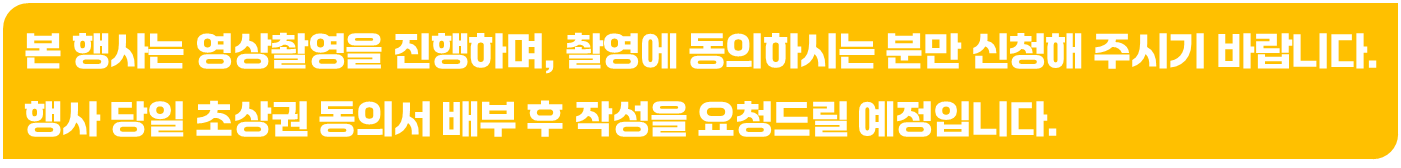 - 본 행사는 영상촬영을 진행하며, 당일 초상권 동의서 배부 후 작성을 요청드릴 예정입니다. - 공연 중 무단 촬영, 녹음, 배포를 금지합니다. - 핸드폰은 매너모드 또는 비행기 모드로 전환하여 주시기 바랍니다.