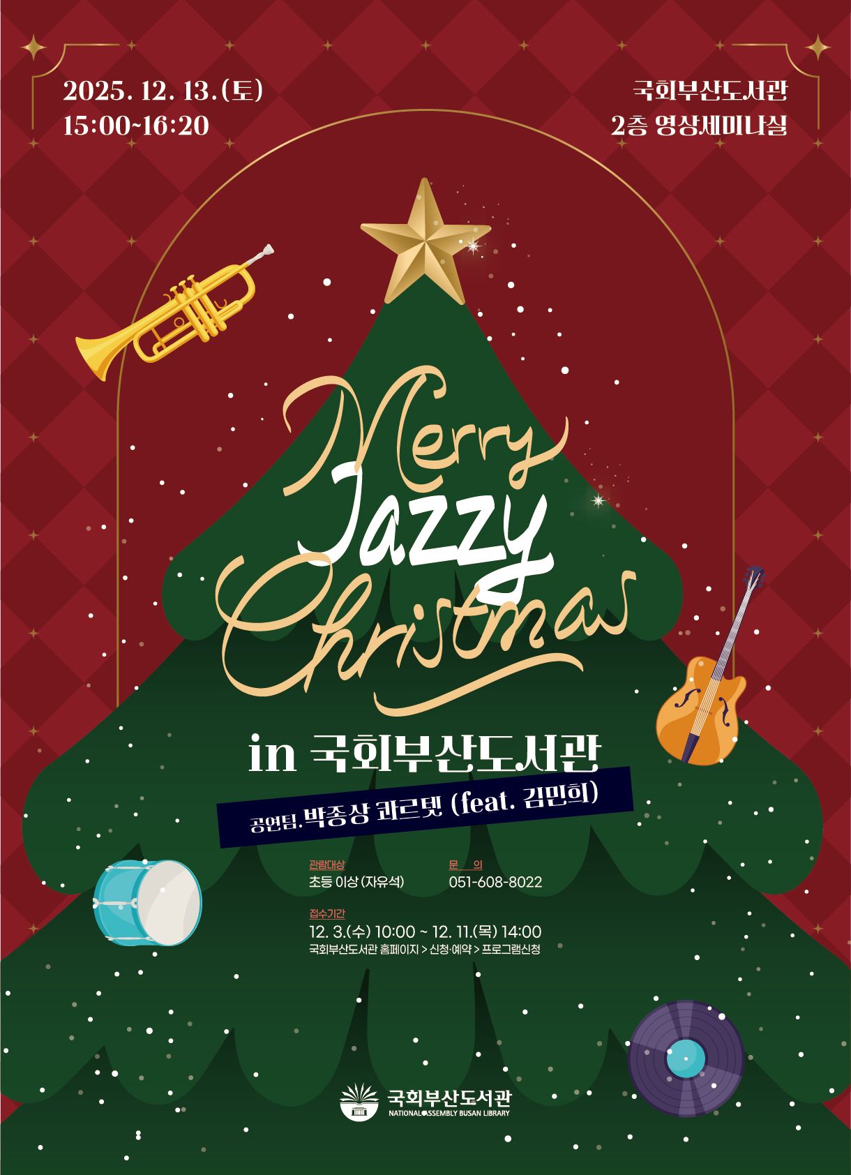 『Merry Jazzy Christmas in 국회부산도서관』 ○ 일시: 2025. 12. 13.(토) 15:00 ~ 16:20 ○ 장소: 국회부산도서관 2층 영상세미나실 ○ 모집 인원: 110명 (*현장 접수 포함)