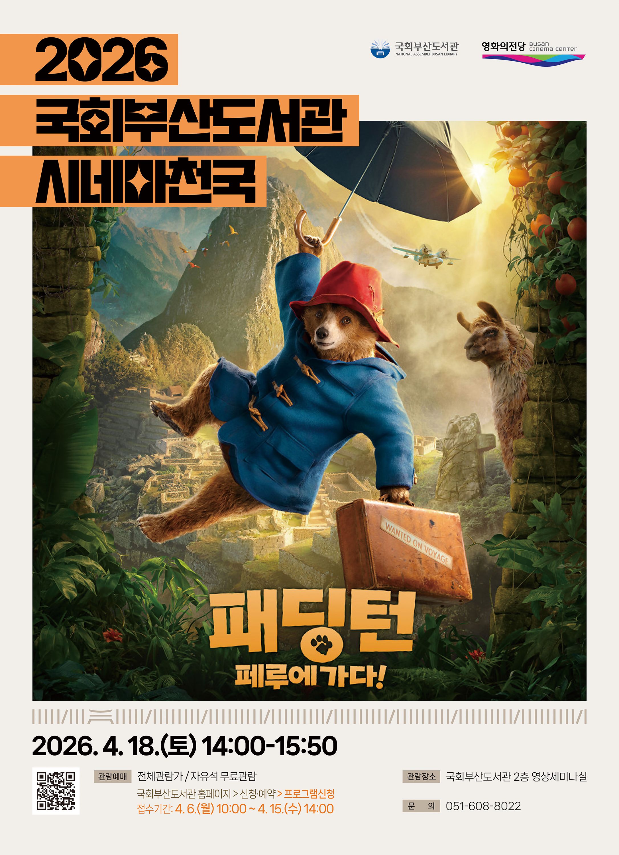 영화의전당과 함께하는 2026 국회부산도서관 시네마천국 ○ 일시: 2026. 4. 18.(토) 14:00~15:50 ○ 장소: 국회부산도서관 2층 영상세미나실 ○ 모집 인원: 100명 (*현장접수 인원 별도) ○ 상영작 개요 - 상영작품: 패딩턴 페루에 가다 (2025년 2월 개봉작) - 상영시간: 106분 - 자료종류: Blu-Ray (한국어 더빙판) - 관람연령: 전체관람가 - 소개: 영국 국민으로 거듭난 ‘패딩턴’에게 어느 날 고향인 페루에서 날아온 의문의 편지 한 통. “루시 숙모님이 사라졌어요!” 지도 한 장만 남긴 채 사라져 버린 ‘루시’ 숙모를 찾아 떠난 ‘패딩턴’과 브라운 가족은 페루의 정글을 둘러싼 비밀을 찾아 모험을 떠나게 되는데... 모험천만 아마존 정글에 뛰어든 도시곰 ‘패딩턴’과 브라운 가족! ※ 상영 일정, 작품, 관람 인원 등은 사정에 따라 변경될 수 있습니다.