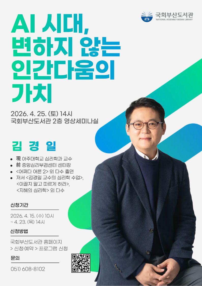 ⊙ 강좌명ㅣ[휴먼라이브러리] AI 시대, 변하지 않는 인간다움의 가치 ⊙ 대 상ㅣ 성인, 청소년 ⊙ 일 시ㅣ 2026. 4. 25.(토) 14:00~15:30 ⊙ 장 소ㅣ 국회부산도서관 2층 영상세미나실 ⊙ 강 사ㅣ 김경일 교수