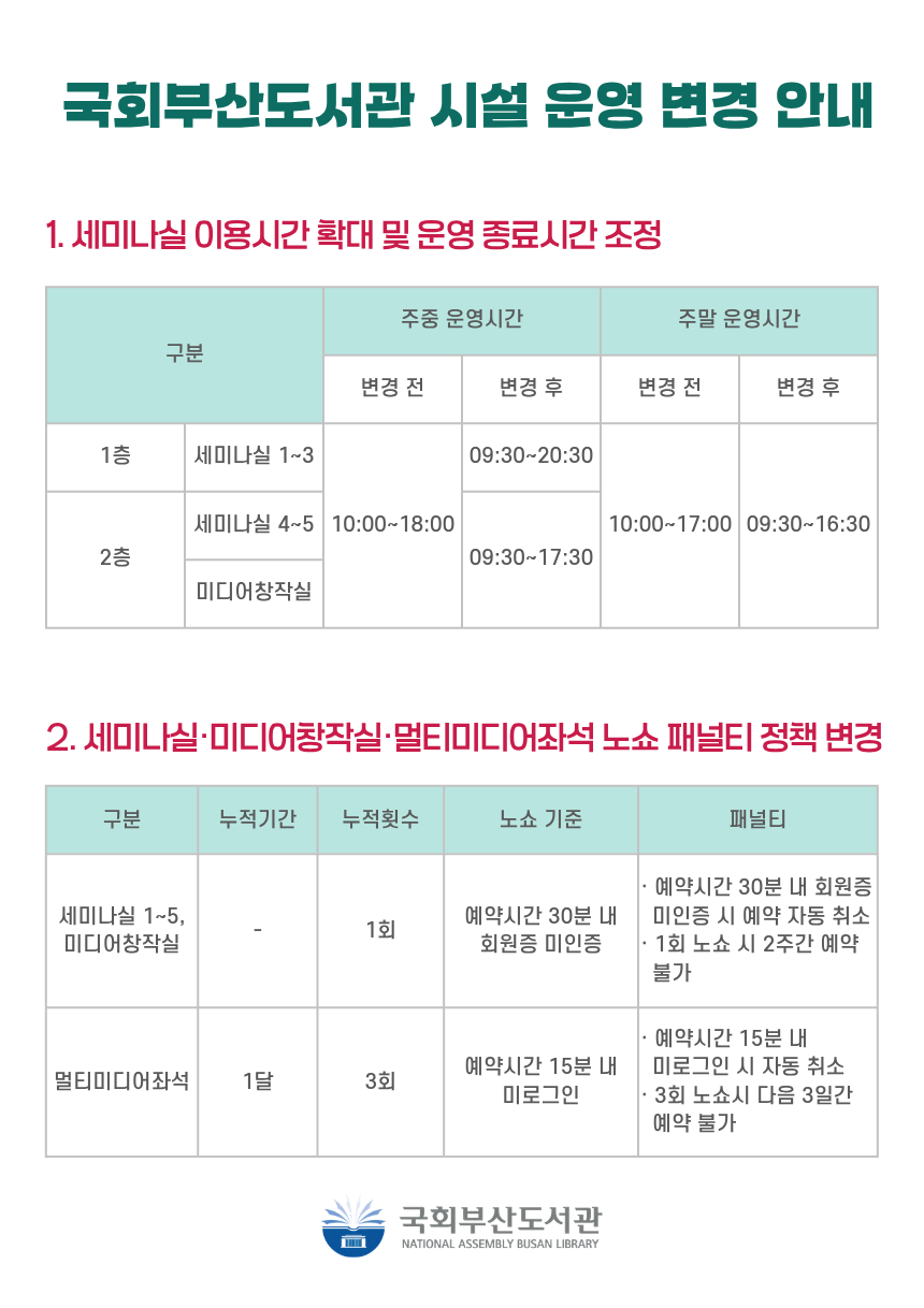도서관 시설 이용의 효율성 및 형평성 제고를 위하여, 2026년 1월 1일자로 국회부산도서관 세미나실·미디어창작실 및 멀티미디어좌석 운영 방침이 아래와 같이 변경됩니다.